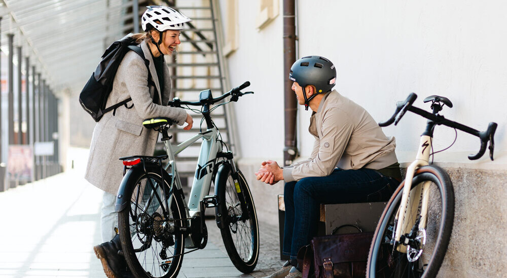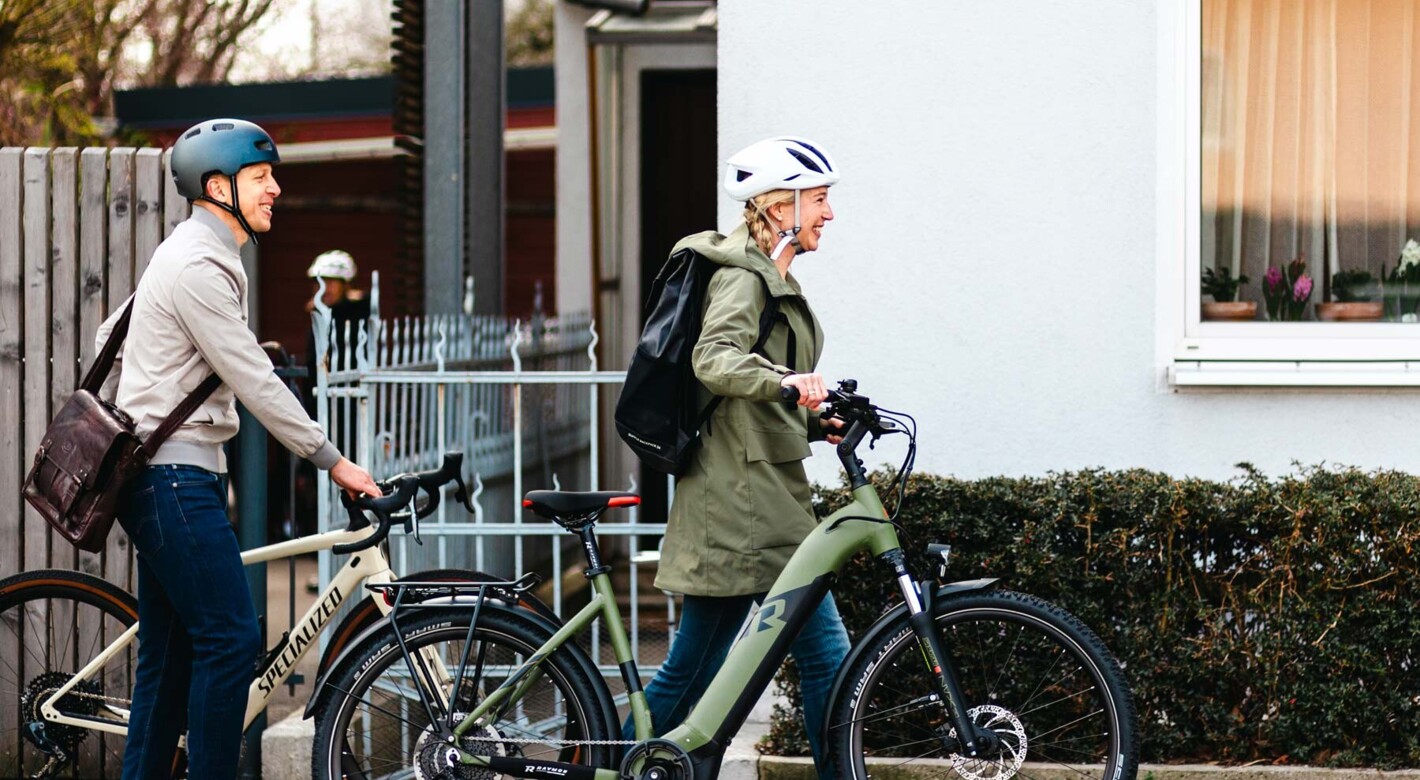 Ein Mann und eine Frau, beide mit Fahrradhelmen, schieben ihre Fahrräder eine Straße entlang. Sie lächeln und tragen sportliche Freizeitkleidung. Im Hintergrund ist ein Zaun und ein Gebäude zu sehen.